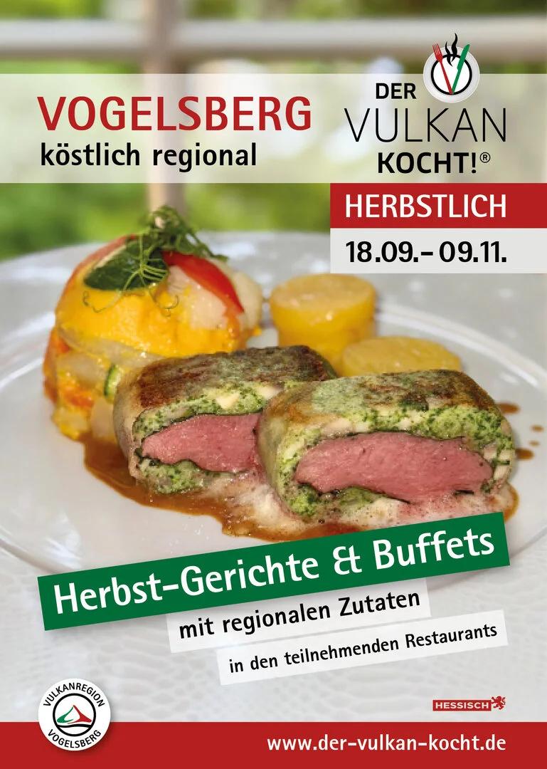 Im Herbst stehen traditionelle Spezialitäten wie Hirschbraten, Rehrücken, Wildschweingulasch, Fisch-, Pilz-, Kartoffel- oder Kürbisgerichte auf der Speisekarte – mal klassisch, mal neu interpretiert. Ein besonderes Highlight ist das aromatische Fleisch des Roten Höhenviehs aus dem Vogelsberg.