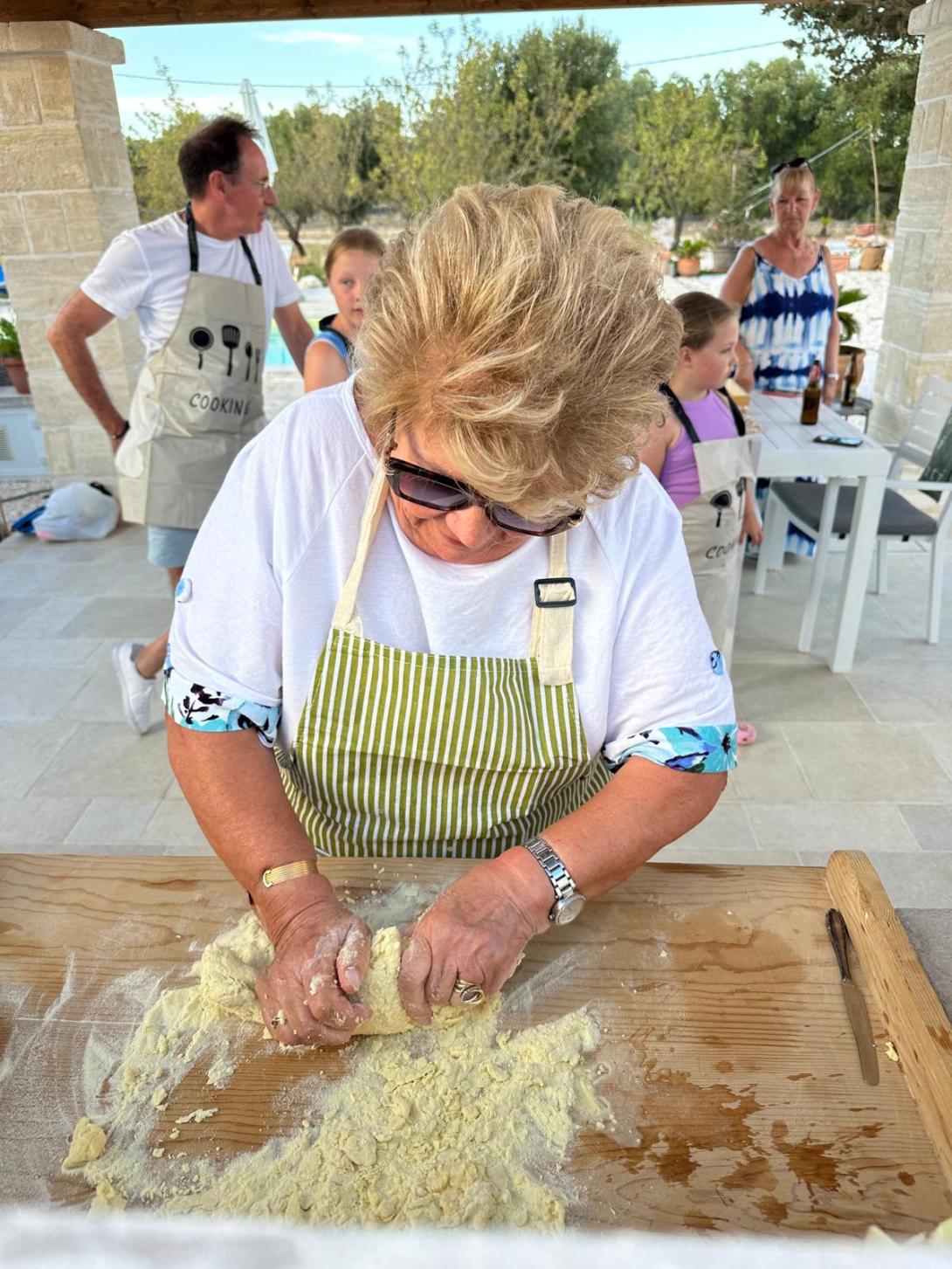Von Ostuni aus ist man schnell im Valle d’Itria, auch bekannt als Tal der Trulli. Dieses berühmte Tal, dessen Mittelpunkt und Leuchtturm die UNESCO Welterbestadt Alberobello ist, erstreckt sich zwischen den Provinzen Brindisi, Bari und Taranto. Hier gibt es die größte Konzentration von Trulli, diesen typischen Rundbauten mit ihren „Zipfelmützen“. Überall stehen die grauen oder weißen Kegel, einzeln oder in Gruppen, zwischen den Olivenbäumen. Ursprünglich waren die runden Häuser einfache Unterkünfte oder Schutzhütten für die Bauern. Ohne Mörtel nur als Trockenmauerwerk aus Kalksteinen waren sie schnell aufgeschichtet und praktisch. Die dicken Mauern halten auch heute noch die Innenräume im Sommer kühl und im Winter vergleichsweise warm. Die Bauweise, die sich ab dem Spätmittelalter in Apulien entwickelte, hatte viele Vorteile, auch, dass man einen Trullo schnell wieder abbauen konnte. Viele der Rundbauten zerfielen im Laufe der Jahre, von den Erhaltenen sind Inzwischen viele zu Feriendomizilen geworden. Wir besuchen Anna in ihrem Trullo den sie von ihrem Großvater geerbt hat. Nebenan befindet sich eine Lamia, ein ebenfalls typischer, etwas modernerer Typ von Wohn- und Wirtschaftsgebäuden. Beides ist umgeben von Olivenbäumen, soweit das Auge reicht. Ein Pool sorgt an heißen Tagen für Abkühlung. Nur die Zikaden verursachen Lärm in diesem Paradies, in dem sie ihre Gäste empfängt. Sie pflückt eine Feige und sagt, dass die Früchte im Gegensatz zu früher, jetzt schon im Juli reifen. Wer hier, mitten in der Natur lebt, beobachtet und pflegt sie gut. Wenn ihre Gäste es wünschen, eilt Mama Rosina herbei und zeigt ihnen, wie original apulische Küche geht: Eintopf mit Kartoffeln, Reis und Muscheln ist ihre ganz besondere Spezialität, aber auch wie die Orecchiette hergestellt werden kann man von ihr lernen. Typischerweise werden die kleinen Muschelnudeln mit Knoblauch, Sardellen und Cime di Rapa – einer Art wildem Broccoli serviert. Polpette, Bällchen aus Fleisch, aber auch aus Brot und Gemüse schmecken köstlich, wenn sie unter dem Mandelbaum im Freien vor dem Trullo serviert werden, wo Anna den Tisch für ihre Gäste deckt.
