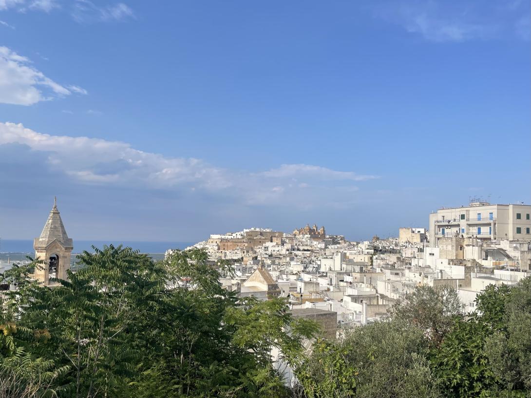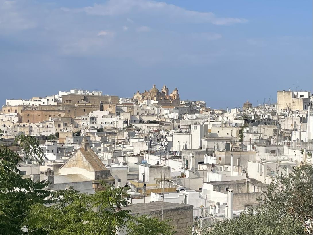Ostuni „la città bianca“, die „weiße Stadt“ gehört zu den beliebtesten Zielen der südöstlichen Region, am Absatz des italienischen Stiefels. Die auf einem Hügel erbaute Stadt schwebt zwischen Himmel und Meer, der Blick reicht weit, über Olivenhaine bis hin zur Adria. Egal, ob tagsüber oder nachts, Ostuni hat eine magische Ausstrahlung und Anziehungskraft. Die Altstadt, ein Labyrinth aus engen Gassen, Treppen und Bögen lädt zum Flanieren ein. Luxuriöse Boutiquehotels, die in den letzten Jahren entstanden sind ziehen ein internationales Publikum an. Immer wieder überraschen kleine Plätze und blumengeschmückte Innenhöfe. Die weißgetünchten Häuser und die mit Blumentöpfen dekorierten Treppen erinnern an das Flair griechischer Inseln. Die weiße Kalkfarbe der Häuser diente, wie dort, früher nicht nur der Schönheit, sondern auch der Hygiene und Kühlung der Stadt. Sehenswert ist die spätgotische Kathedrale aus dem 15. Jahrhundert. Sie ist das wichtigste Bauwerk, aber auch Teile der alten Stadtbefestigung sind erhalten, aus der Zeit, als Ostuni eine strategisch wichtige Bedeutung hatte. Von hier aus genießt man oft großartige Ausblicke auf die Landschaft. Abends, wenn die Sonne hinter den Hügeln versinkt, trifft man sich, vielleicht nach einem Tag an einem der nahegelegenen Strände zum Aperitif.  Zu späterer Stunde bevölkern dann Nachtschwärmer die Treppenstufen und Gassen der Stadt und genießen das mediterrane Flair in den zahlreichen Bars und Restaurants.