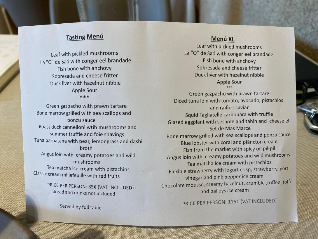 Ich entscheide mich für das Degustationsmenü für 85 € und verlasse mich auf die Weinempfehlung von Mònica Farré. Aufgetischt wird in den nächsten zwei Stunden alles, was auf dem Menüfoto zu sehen ist – und mehr, denn es beginnt mit zwei Grüßen aus der Küche. Jeder einzelne Gang ist ein Gedicht – oder, in den Worten des Koches, eine Geschichte über die Region in Katalonien.