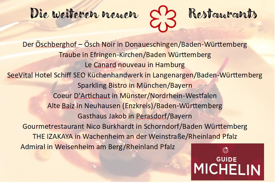 In der 'Sternengalerie' haben wir sämtliche neuen 3, 2 und 1-Sterneträger des Guide MICHELIN zusammengestellt. Aus der Bildunterschrift kann man sich direkt auf die jeweiligen Homepages der Restaurants klicken. Wir gratulieren sämtlichen neuen Sterneträgern und natürlich auch allen Köchen und Küchenteams die ihre Leistungen aus dem letzten Jahr bestätigt haben.
