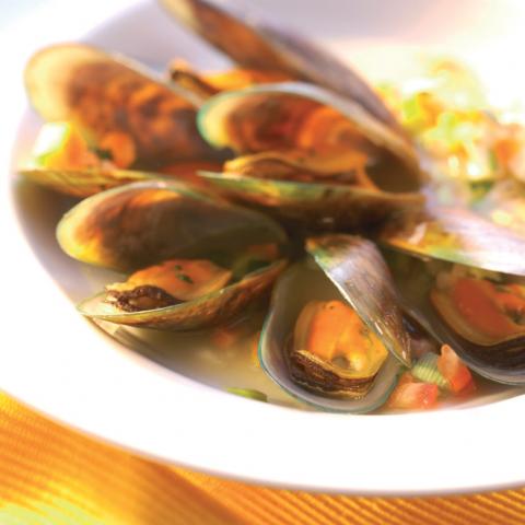 - In einem großen Topf die Schalotten in etwas Olivenöl anschwitzen, anschließend die Muscheln dazugeben und sofort mit Wein und Fischfond ablöschen. Die Zitronenscheiben beifügen und das Ganze im geschlossenen Topf ca. 6 Minuten leicht kochen lassen.